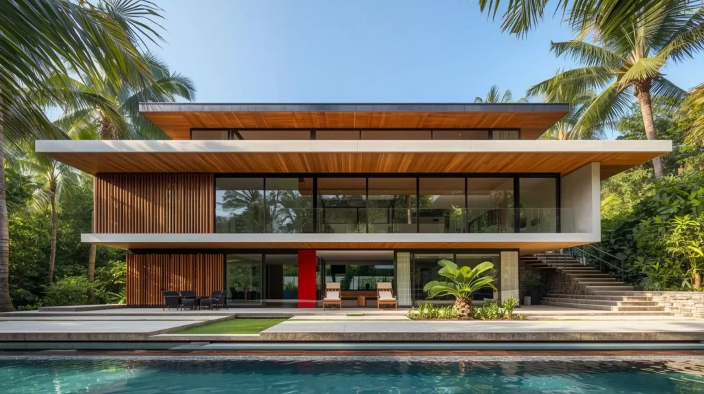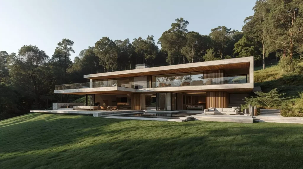 - A “Honestidade” dos Materiais: Materiais estruturais, como o concreto aparente, o aço corten e as superfícies de madeira natural, são exibidos sem revestimentos desnecessários. Essa honestidade técnica confere uma textura bruta, sofisticada e altamente tátil ao projeto.